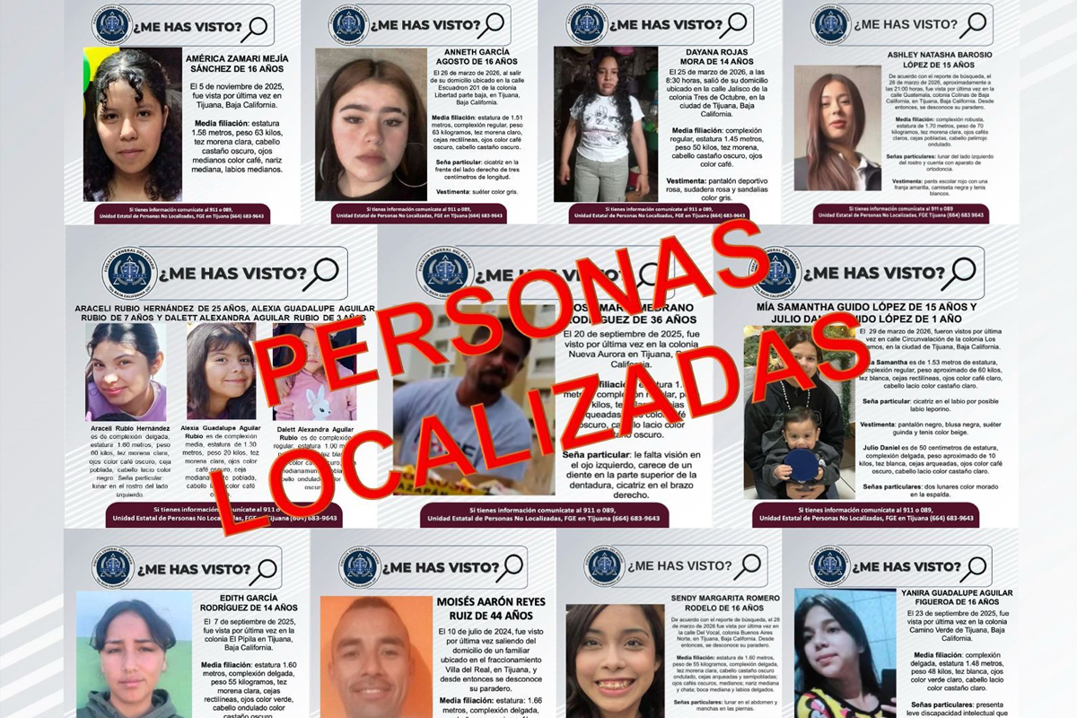 La Fiscalía General del Estado informó la localización de 14 personas que contaban con reporte de desaparición en Tijuana y Playas de Rosarito, todas en buen estado de salud.
