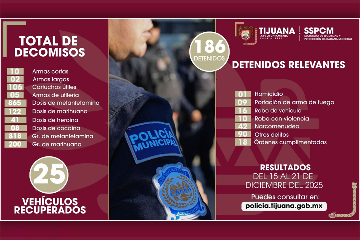En una semana marcada por operativos y recorridos preventivos, la Policía Municipal logró la detención de 186 personas y el aseguramiento de más de mil dosis de distintas drogas, además de armas y vehículos con reporte de robo, como parte de las acciones de seguridad implementadas en la ciudad.