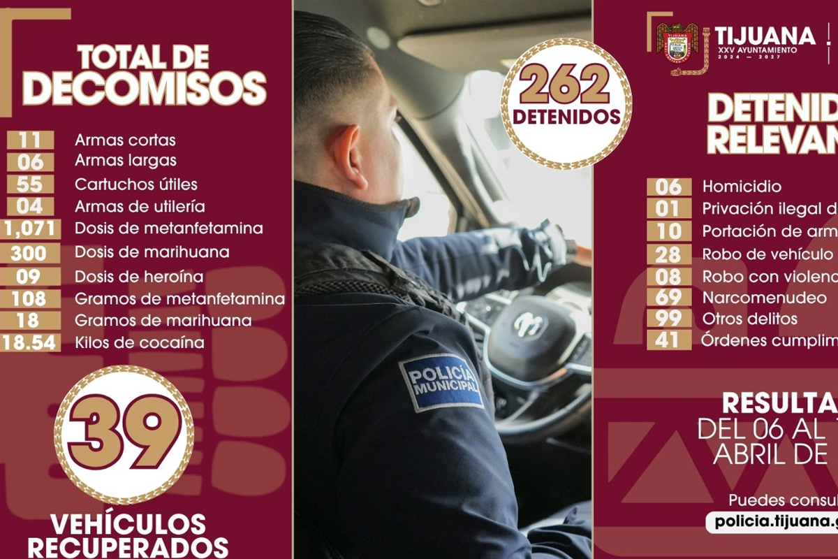 TIJUANA, BC, (NDT).- De acuerdo con la Secretaría de Seguridad y Protección Ciudadana Municipal, los resultados derivan de operativos enfocados en zonas con mayor incidencia delictiva, así como de la atención a reportes ciudadanos. Entre los detenidos se encuentran seis personas por homicidio, una por privación ilegal de la libertad, diez por portación de arma de fuego, 28 por robo de vehículo, ocho por robo con violencia, 69 por narcomenudeo, 99 por diversos delitos y 41 con órdenes de aprehensión activas.
