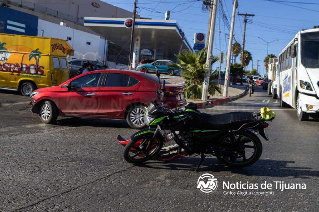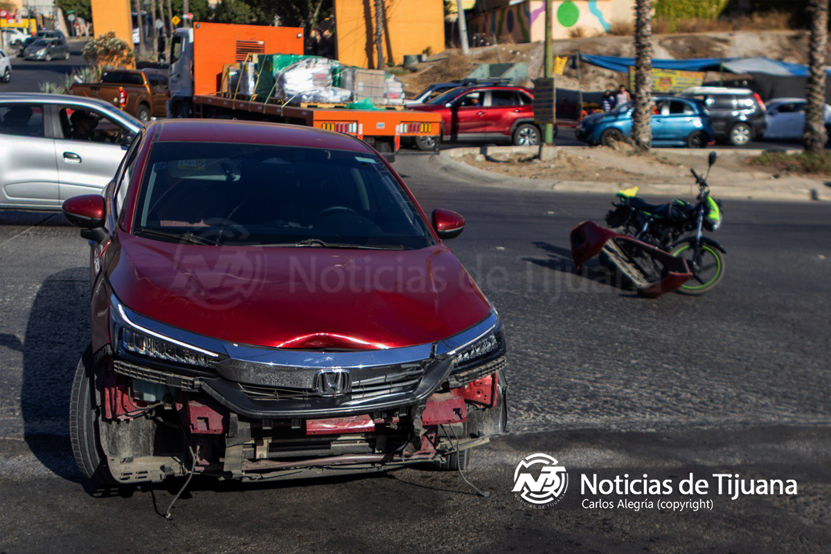 El automóvil implicado correspondía a un Honda guinda, que quedó detenido junto con la motocicleta en medio de la intersección, ocupando el área de paso y generando la interrupción del flujo vehicular.