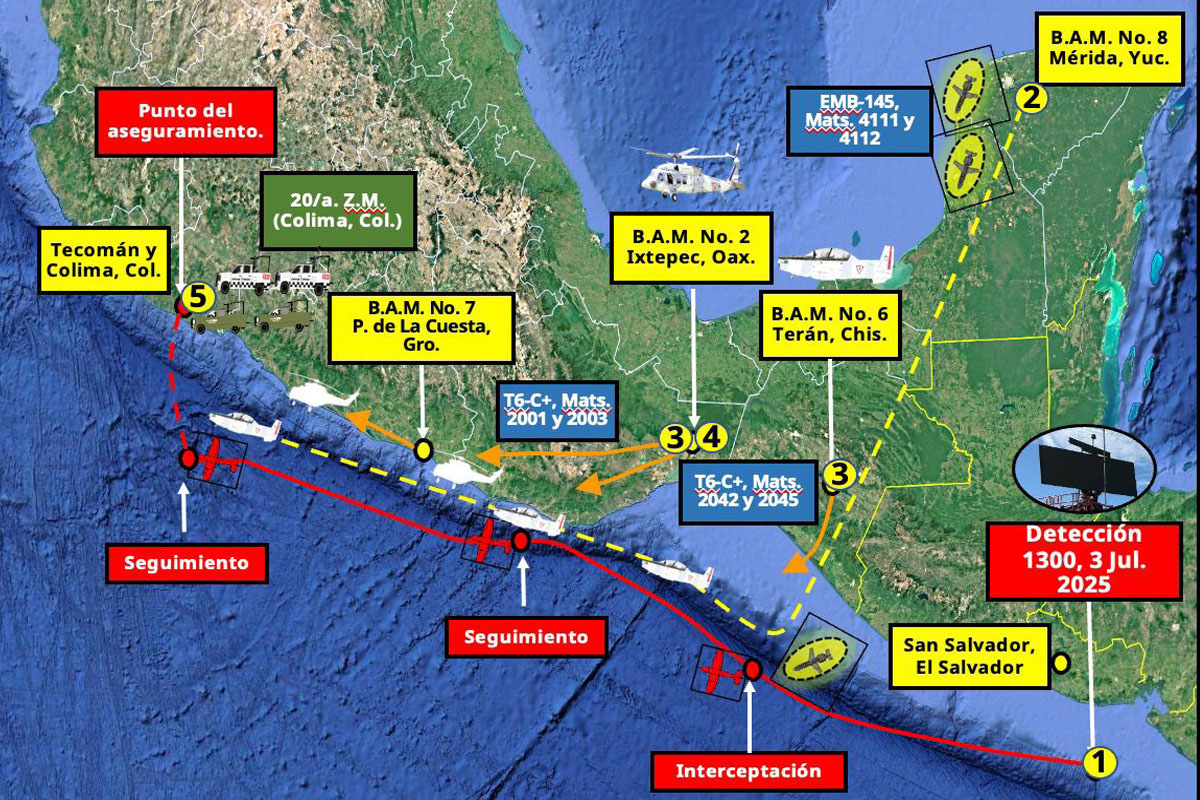 El funcionario explicó que el Centro Nacional de Vigilancia y Protección del Espacio Aéreo (CENAVI) detectó una traza sospechosa a 200 kilómetros al sur de San Salvador, El Salvador, a las 13:00 horas, por lo que se ordenó el despliegue de aeronaves desde diferentes bases aéreas mexicanas para ubicar la trayectoria de vuelo e interceptar la aeronave en puntos posibles de aterrizaje.