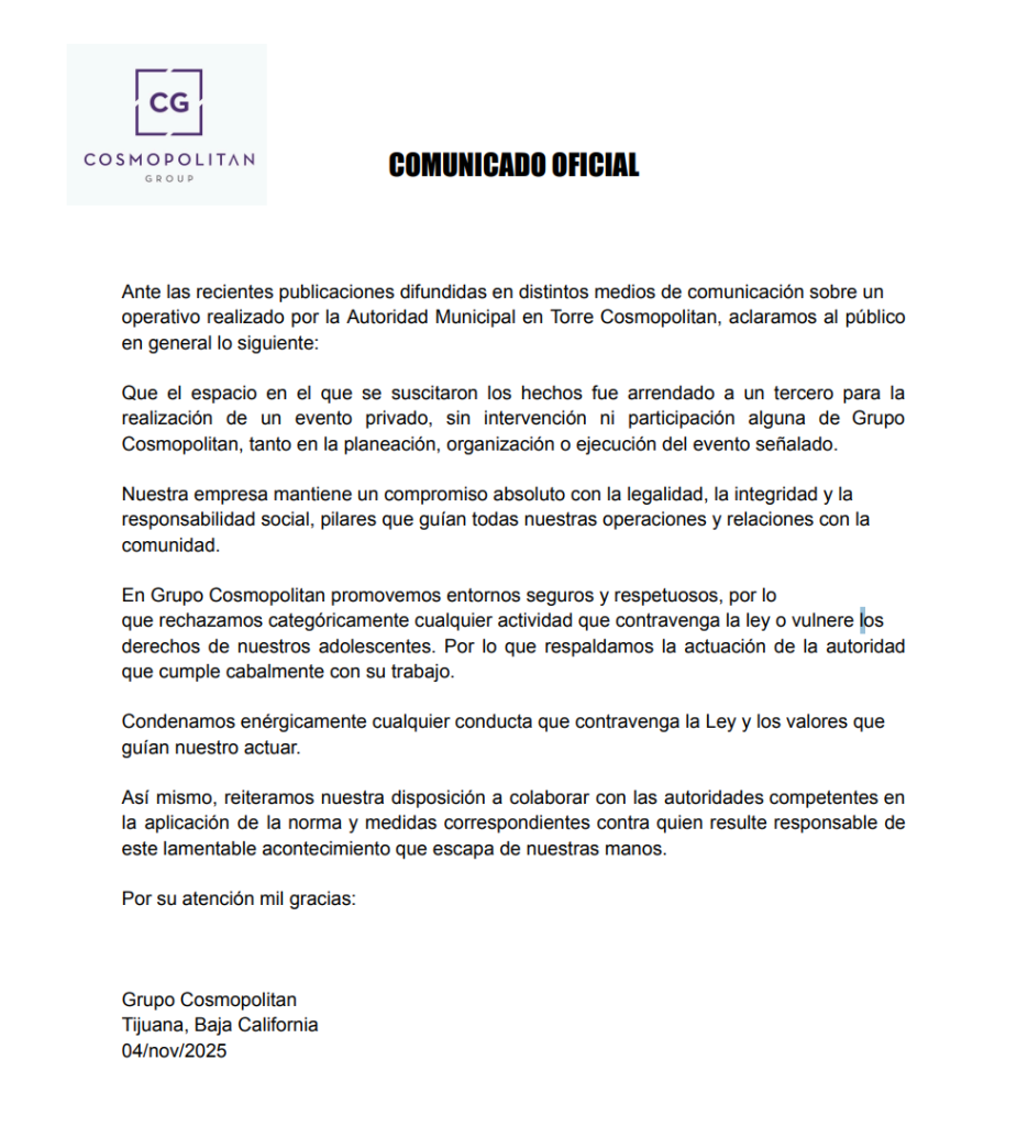 En un tono que enfatiza su compromiso con la legalidad, la compañía subraya que sus operaciones se guían por “la integridad y la responsabilidad social.” El Grupo Cosmopolitan condenó el evento, mencionando que promueven “entornos seguros y respetuosos,” y rechazan “categóricamente cualquier actividad que contravenga la ley o vulnere los derechos de nuestros adolescentes.”