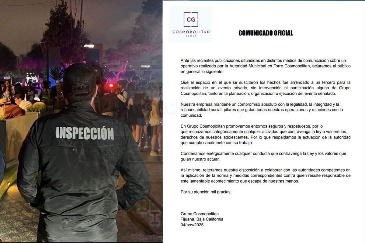 La empresa constructora y de bienes raíces respondió así a las “recientes publicaciones difundidas en distintos medios de comunicación” sobre el operativo. De manera concisa, Cosmopolitan argumenta que el espacio en cuestión fue arrendado a un tercero para un evento privado, y que su grupo no tuvo “intervención ni participación alguna en la planeación, organización o ejecución del evento señalado.”