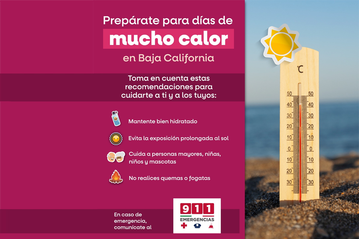 La Coordinación Estatal de Protección Civil (CEPC) advierte que, de acuerdo con el pronóstico del Servicio Meteorológico Nacional (SMN) del miércoles 9 al viernes 11 de julio se mantendrán temperaturas elevadas en diversos municipios de Baja California, principalmente en Mexicali y San Felipe.