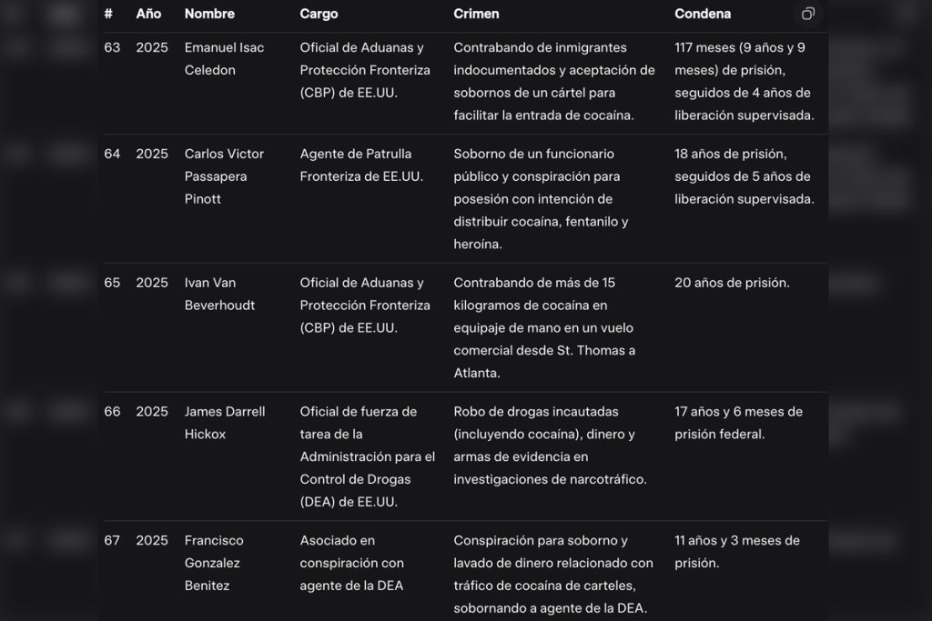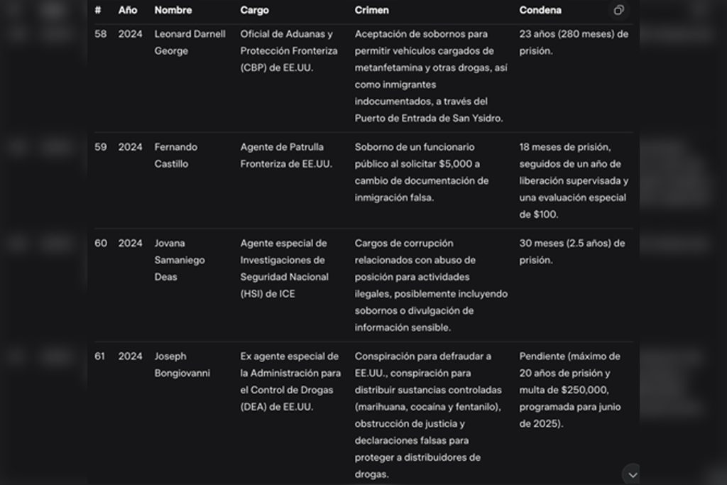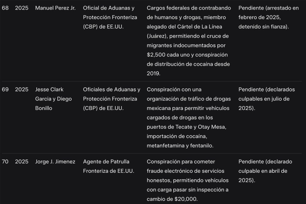 En 2024, el inspector Leonard Darnell George recibió una pena de 23 años de prisión por permitir cruces de vehículos con metanfetamina e indocumentados en San Ysidro. También, el agente de la Patrulla Fronteriza (USBP), Fernando Castillo, recibió 18 meses por solicitar sobornos a cambio de documentación migratoria falsa en El Paso.