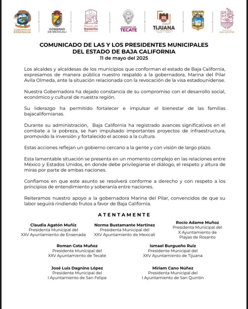 “Reiteramos nuestro apoyo a la gobernadora Marina del Pilar, convencidos de que su labor seguirá rindiendo frutos a favor de Baja California”, concluye el comunicado firmado por los alcaldes del estado.