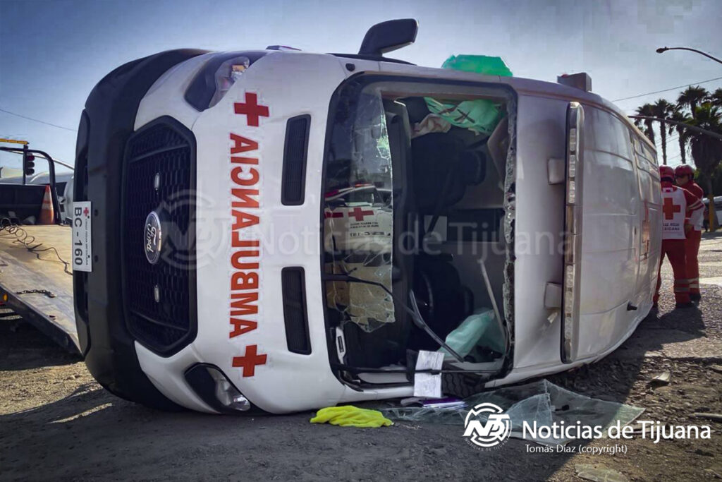 Una ambulancia con número BC-160 terminó en volcadura tras colisionar con un camión de la empresa GALKARZ en el cruce del bulevar Héroes de la Independencia y bulevar Olivos Norte, en el Parque Industrial El Florido.