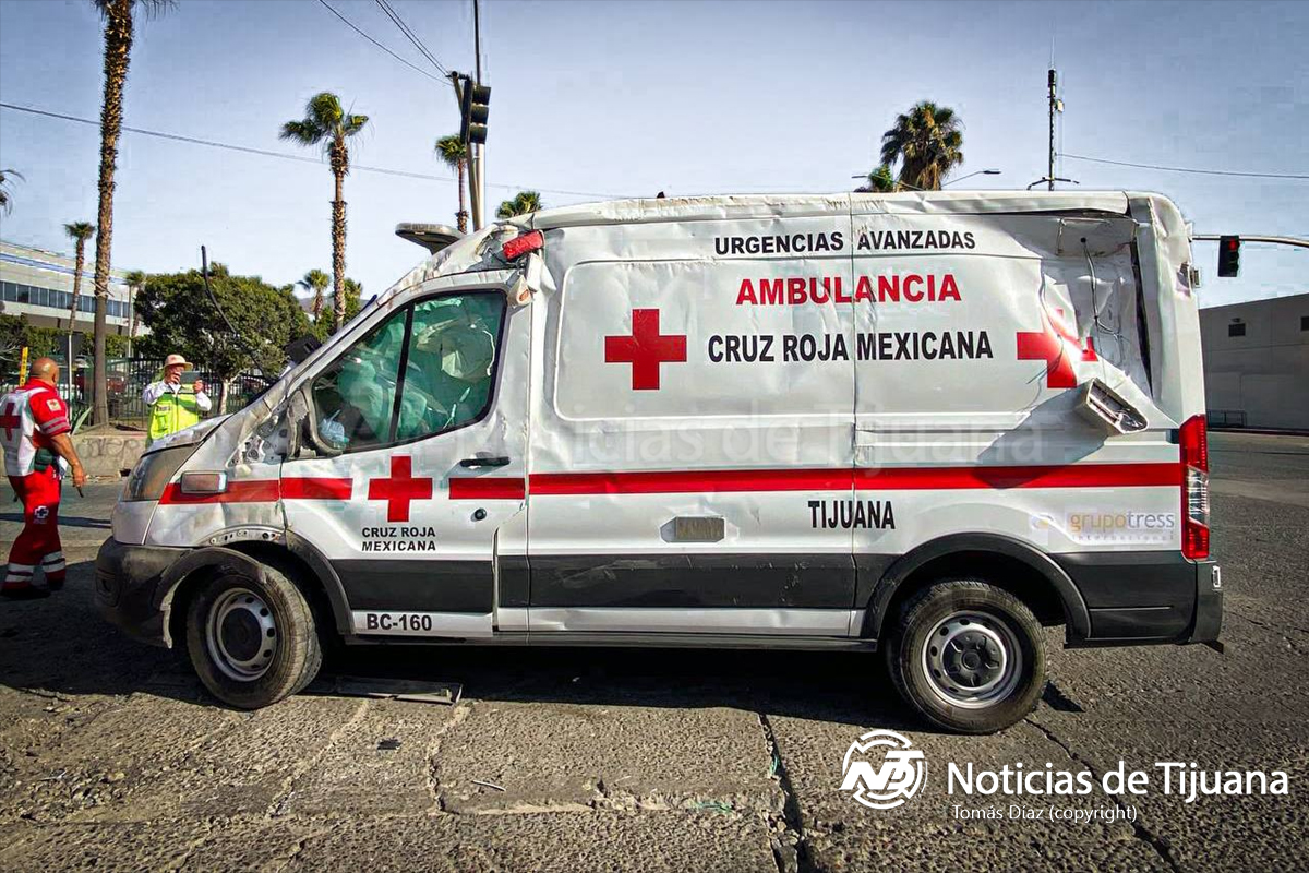 Una ambulancia con número BC-160 terminó en volcadura tras colisionar con un camión de la empresa GALKARZ en el cruce del bulevar Héroes de la Independencia y bulevar Olivos Norte, en el Parque Industrial El Florido.
