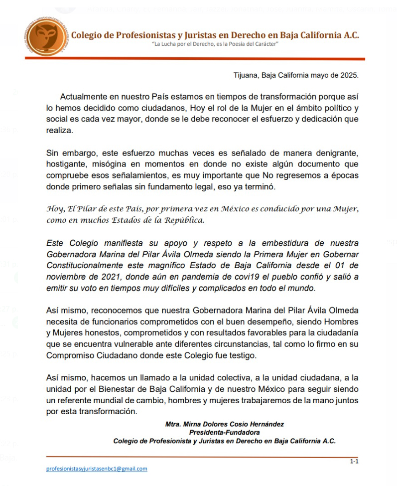 El Colegio de Profesionistas y Juristas en Derecho, liderado por la Mtra. Mirna Dolores Cosío Hernández, celebró el papel histórico de Ávila Olmeda como la primera mujer en gobernar Baja California desde 2021, incluso en tiempos de pandemia. Condenó los señalamientos misóginos sin fundamento y llamó a la unidad ciudadana para consolidar la transformación del estado. “Su compromiso con el bienestar y el estado de derecho es un ejemplo de liderazgo”, afirmó.