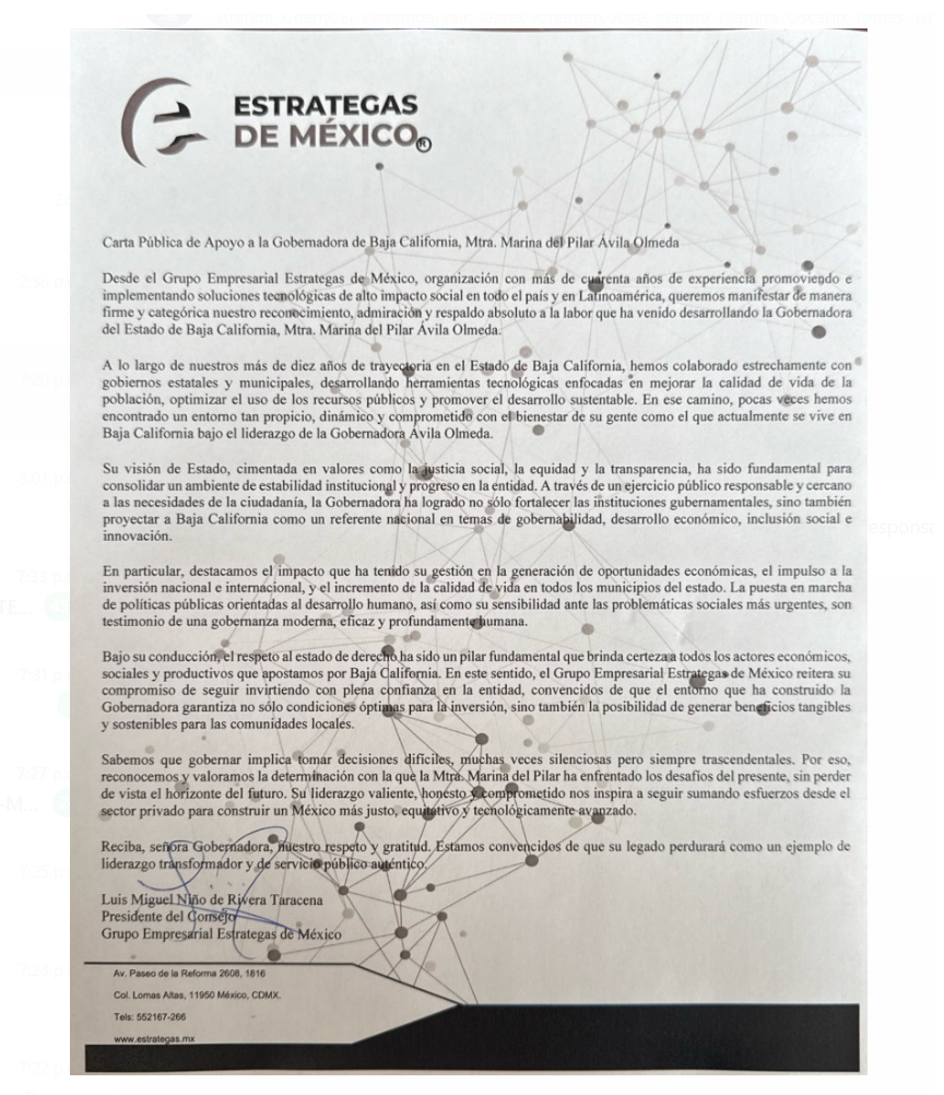 El Grupo Empresarial Estrategas de México, bajo la dirección de Luis Miguel Niño de Rivera Taracena, resaltó la visión de justicia social, equidad y transparencia de la gobernadora, que ha posicionado a Baja California como referente nacional en gobernabilidad e innovación. “Su gestión ha creado un entorno propicio para el desarrollo sustentable y la inversión”, aseguró, comprometiéndose a seguir colaborando con el gobierno estatal.