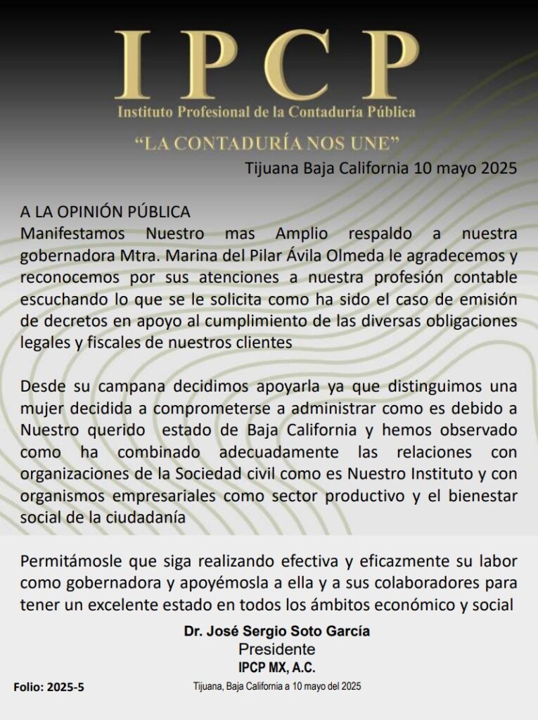 El IPCP, liderado por el Dr. José Sergio Soto García, reconoció a la gobernadora por su apoyo a la profesión contable, especialmente por la emisión de decretos que facilitan el cumplimiento de obligaciones legales y fiscales. “Desde su campaña, vimos en ella una líder comprometida con administrar adecuadamente nuestro estado”, señaló el instituto, que instó a respaldar su labor para consolidar el progreso económico y social.