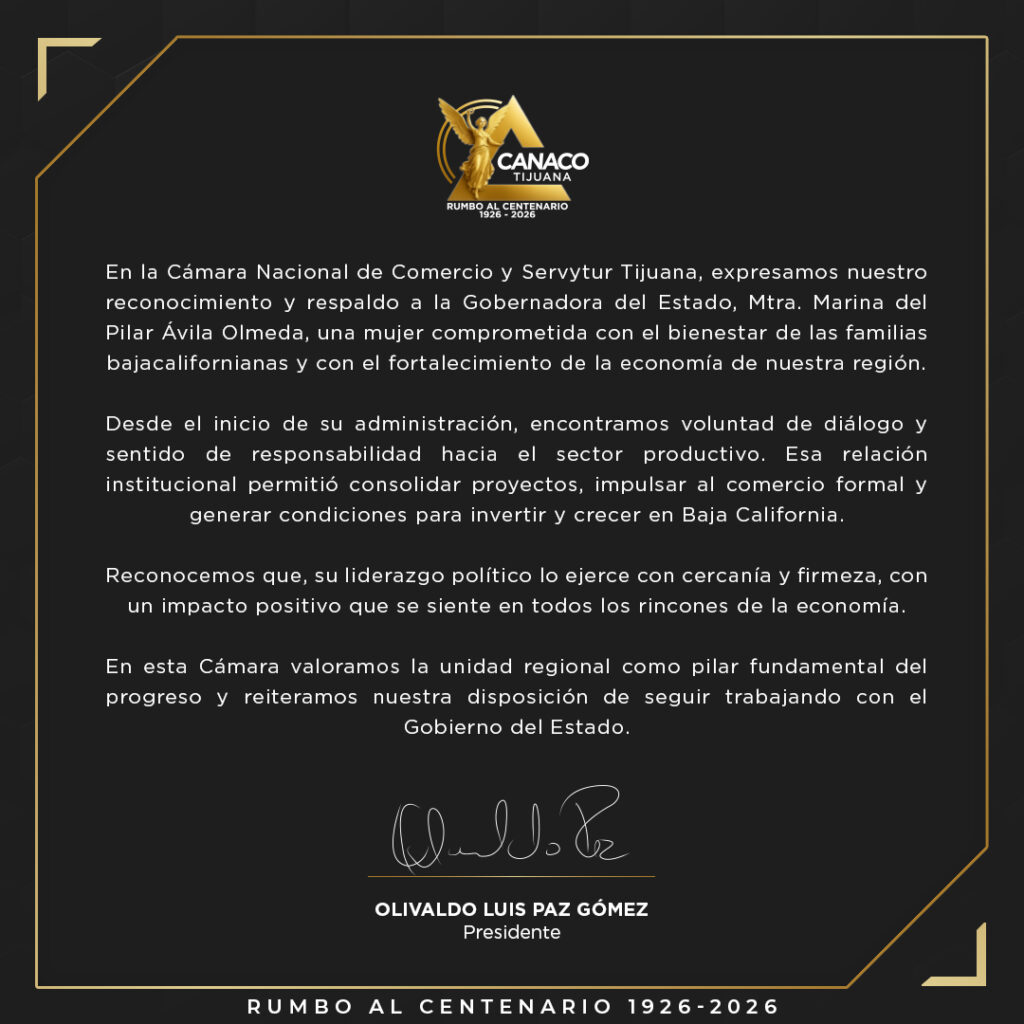 Por su parte, Canaco Servytur Tijuana, presidida por Julián Olivaldo Luis Paz Gómez, elogió la disposición al diálogo y el impulso al comercio formal, destacando que el liderazgo de Ávila Olmeda ha fortalecido la economía regional y generado condiciones óptimas para la inversión. “Su cercanía y firmeza tienen un impacto positivo en todos los sectores”, afirmó.