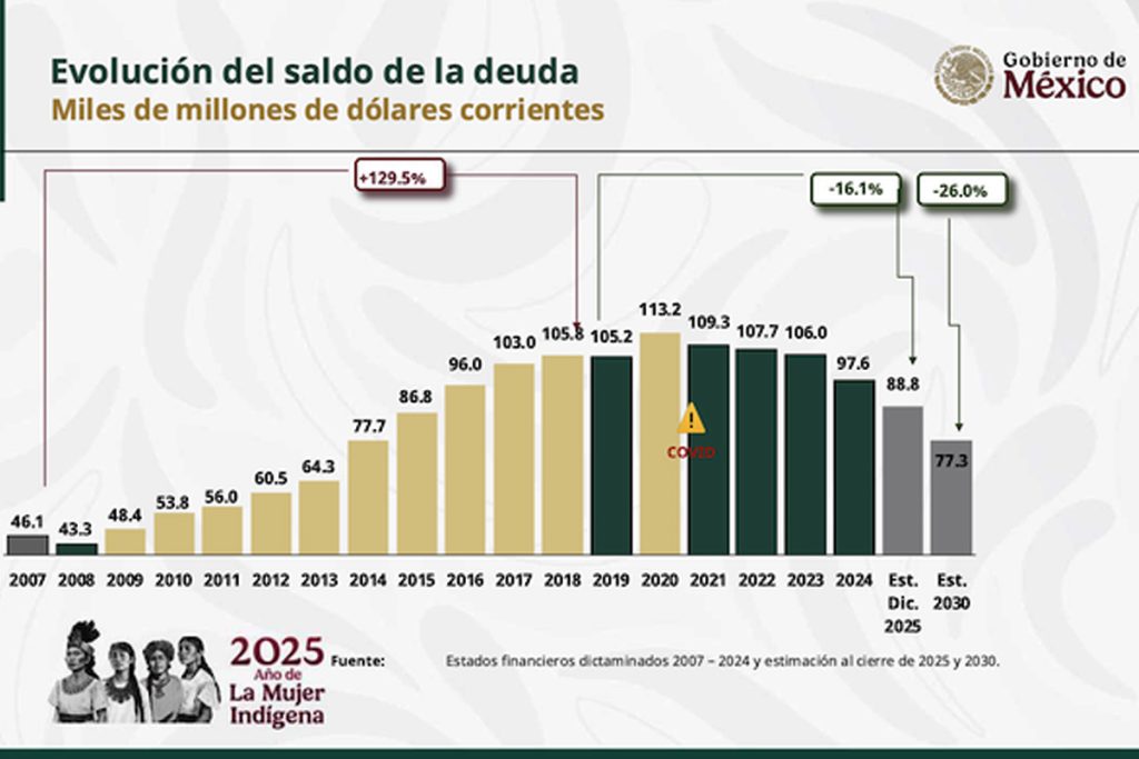 Se explicó que la deuda de Pemex alcanzó 105 mil millones de dólares en 2019, sin embargo, con esta estrategia, se espera que esa cifra disminuya a 77 mil millones de dólares para el año 2030.