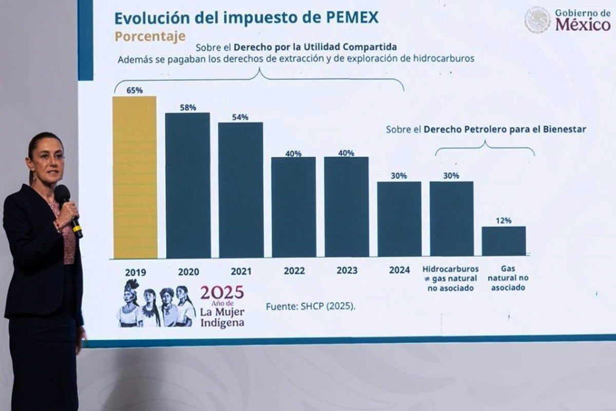 “Las ganancias de Pemex y Hacienda se las quitaba en 60%, y ahora Hacienda solo le quita de las ganancias 30%”, explicó la titular del ejecutivo, al destacar el cambio en la política fiscal.