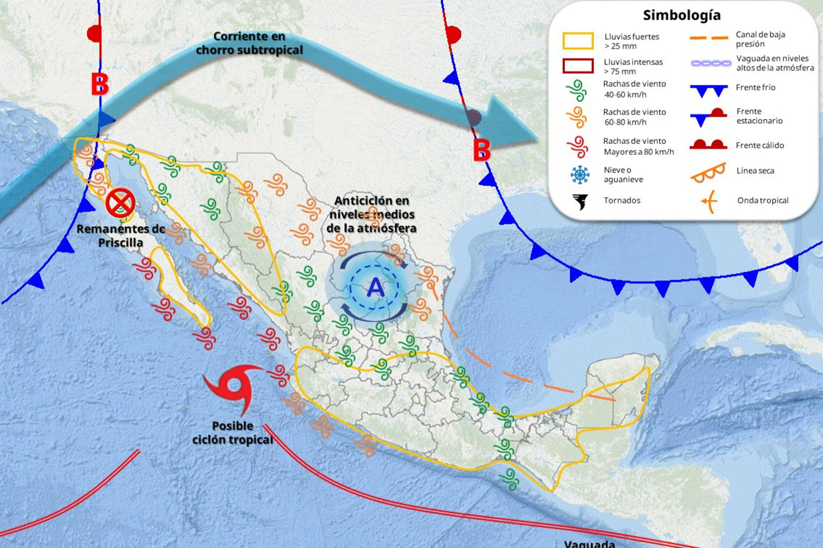 Por otro lado, el coordinador estatal informó que se espera que la tormenta tropical Priscilla se degrade frente a las costas de Baja California Sur, aunque sus efectos podrían seguir aportando humedad en Baja California.