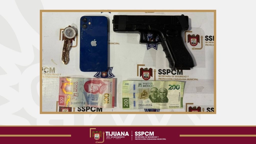 A corta distancia fue detenido Omar “N”, de 25 años de edad, a quien se le encontró una pistola de utilería color negro, un teléfono celular marca iPhone, 300 pesos en efectivo y un reloj color bronce, objetos que presuntamente pertenecen a la víctima.
