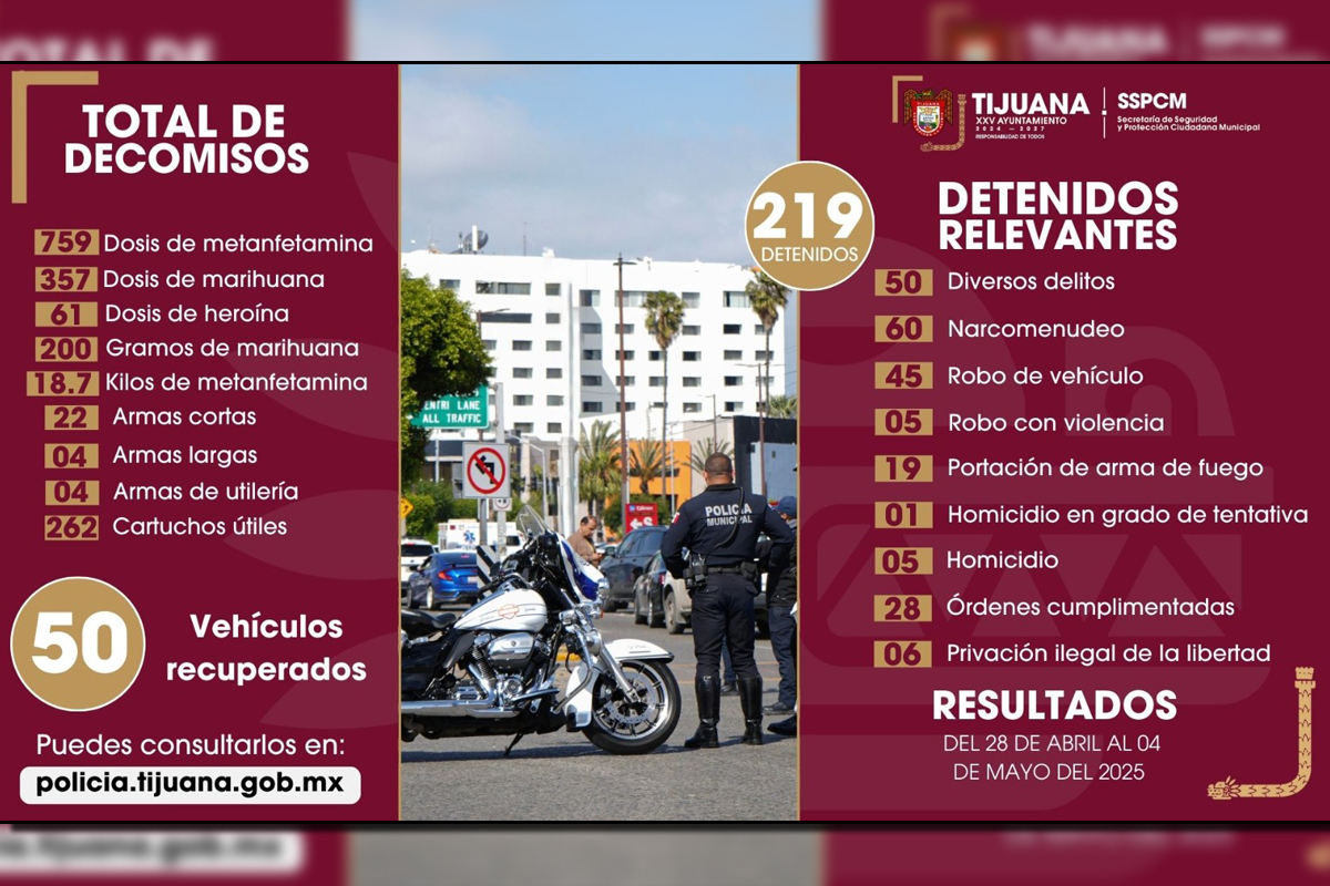 Lo anterior, ha permitido que, en el periodo del 28 de abril al 4 de mayo, se hayan recuperado un total de 50 vehículos que contaban con reporte de robo, lo que se notificó a la autoridad investigadora para el trámite de reintegración a sus respectivos dueños, información que puede ser consultada a través de la página policia.tijuana.gob.mx