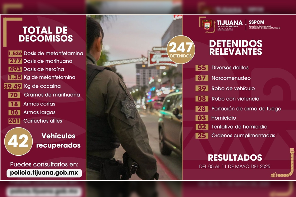 La Secretaría de Seguridad y Protección Ciudadana Municipal (SSPCM) informa que, como resultado de las acciones preventivas implementadas del 5 al 11 de mayo, fueron aseguradas 247 personas señaladas como presuntas responsables de diversos delitos.
