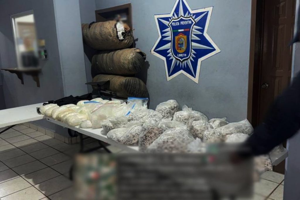 En Loreto, B.C., elementos de la Secretaría de Marina, Policía Estatal y Municipal localizaron un vehículo abandonado en cuyo interior fueron encontrados tres costales con marihuana, 28 envoltorios y 19 bolsas con cristal, dos armas cortas, un chaleco táctico y una báscula.