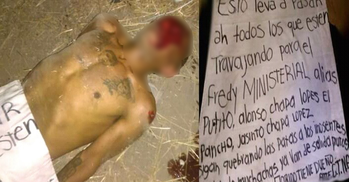‘Esto leva pasar ah todos los que esten travajando para el Fredy MINISTERIAL alias Putito, alonso chapa lopez El pancho, Jasinto chapa lopez sigan quebrando las patas a los inocentes sigan matando muchachas ya van de salida putos’, atte. CTNG