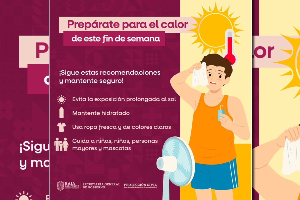 La Coordinación Estatal de Protección Civil (CEPC) informa que, de acuerdo con el pronóstico del Servicio Meteorológico Nacional (SMN), Baja California experimentará un incremento significativo en las temperaturas durante este fin de semana, con máximas de hasta 43 °C, así como vientos con posibles tolvaneras y oleaje elevado en la costa occidental.