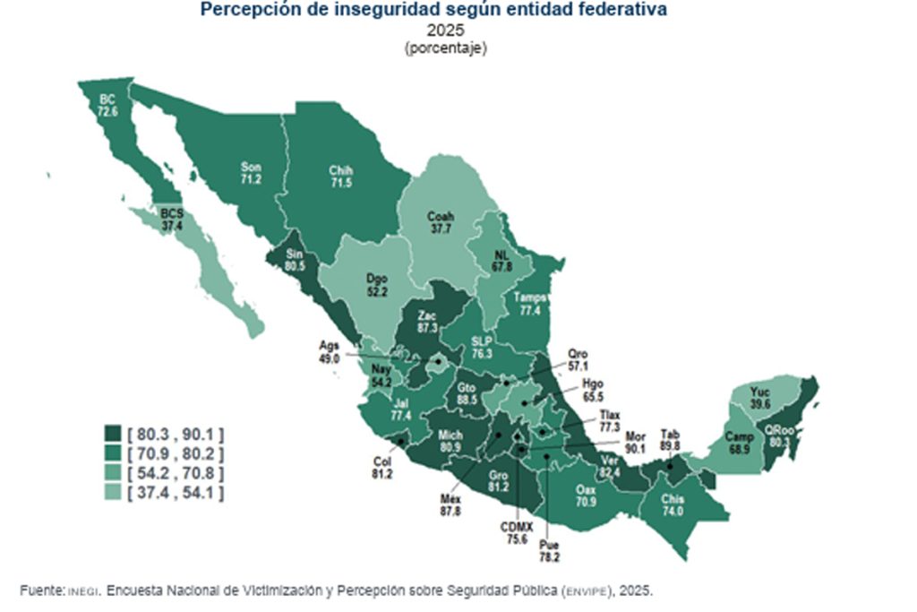 En la comparación nacional, Morelos (90.1%), Tabasco (89.8%) y Guanajuato (88.5%) encabezaron la percepción de inseguridad, mientras que Baja California Sur (37.4%), Coahuila (37.7%) y Yucatán (39.6%) reportaron los niveles más bajos.