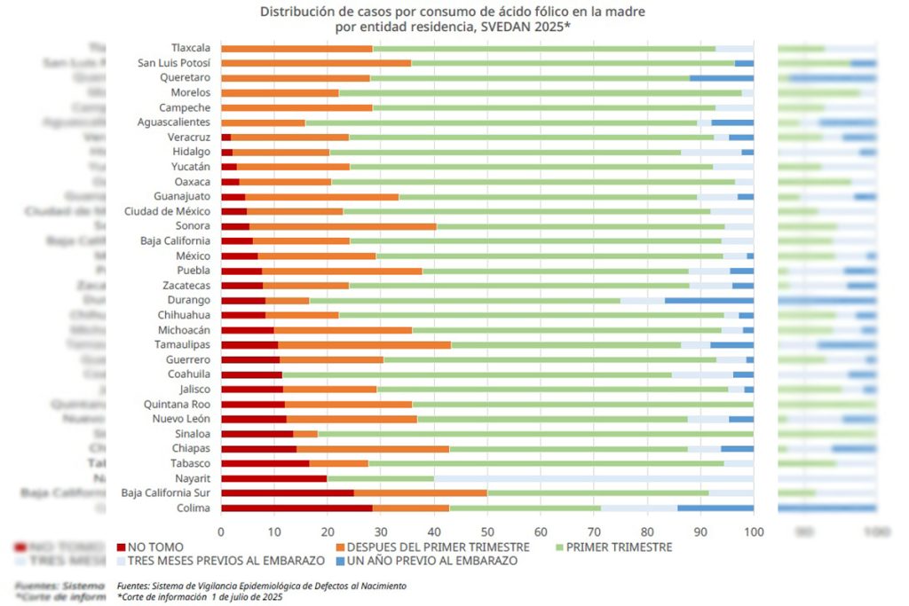 En ese sentido, los registros en Baja California indican que de los casos de madres que reportaron defectos de sus hijos al nacer, el 7% no lo tomó; 17% lo tomó después del primer trimestre; 70% lo hizo durante el primer trimestre y el resto lo hizo tres meses previos al embarazo.