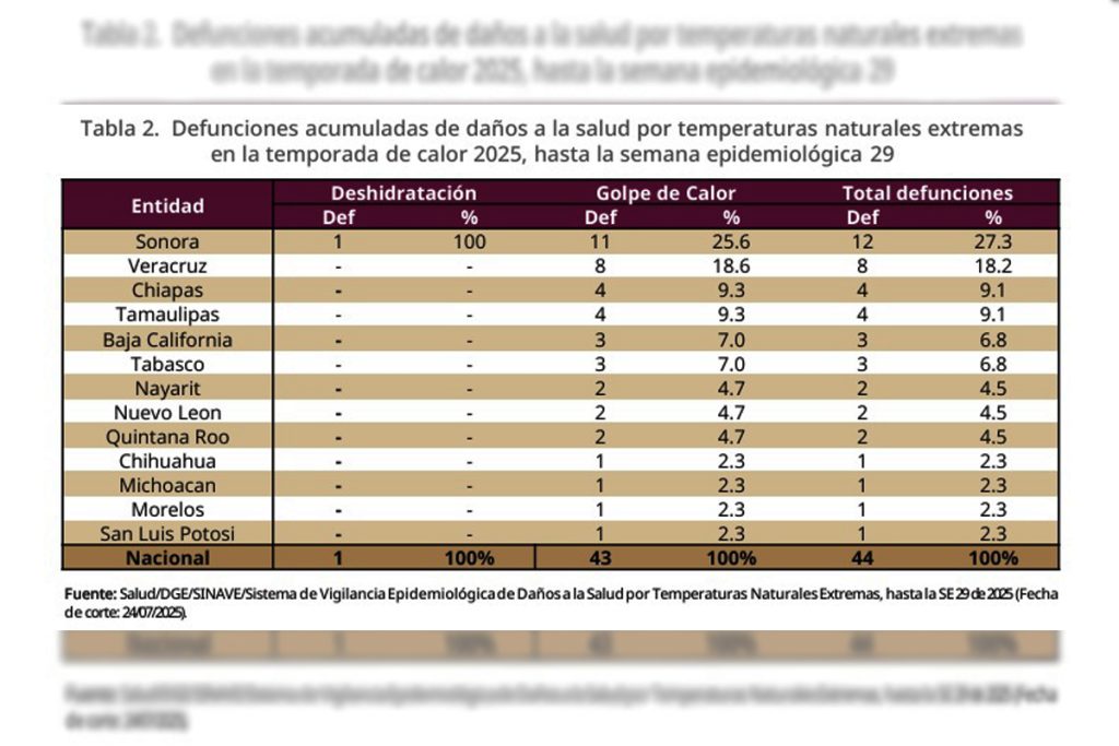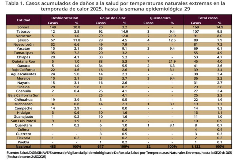 El golpe de calor fue la principal causa de muerte a nivel nacional, con 43 de los 44 decesos registrados y solo una defunción se atribuyó a deshidratación, no obstante, hasta ahora, 28 de las 32 entidades han registrado casos relacionados con calor.