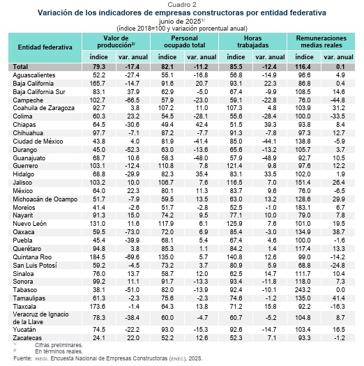 El Inegi informó que el valor de producción de la construcción en México subió 0.9 por ciento mensual, aunque en comparación anual disminuyó 18.2 por ciento, reflejando retroceso pese al repunte observado en junio.