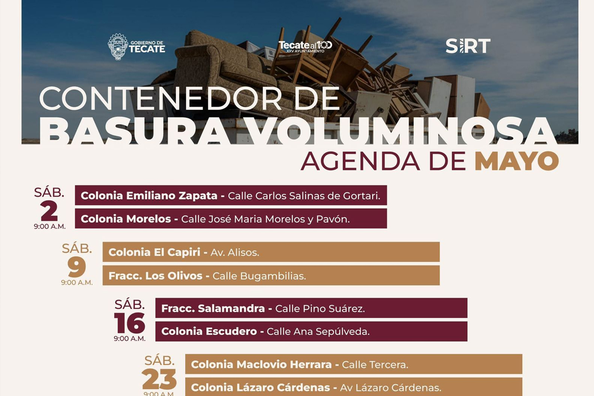 El Gobierno de Tecate dio a conocer el calendario de mayo para la instalación de contenedores destinados a residuos de gran tamaño en distintas colonias del municipio.