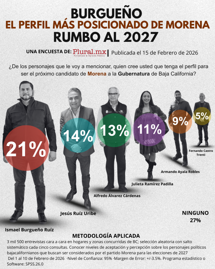 No es una carrera definida, pero sí una fotografía política que revela tendencias que ningún actor puede ignorar. Con 21% de preferencia, Ismael Burgueño aparece como el aspirante más sólido en este momento.
