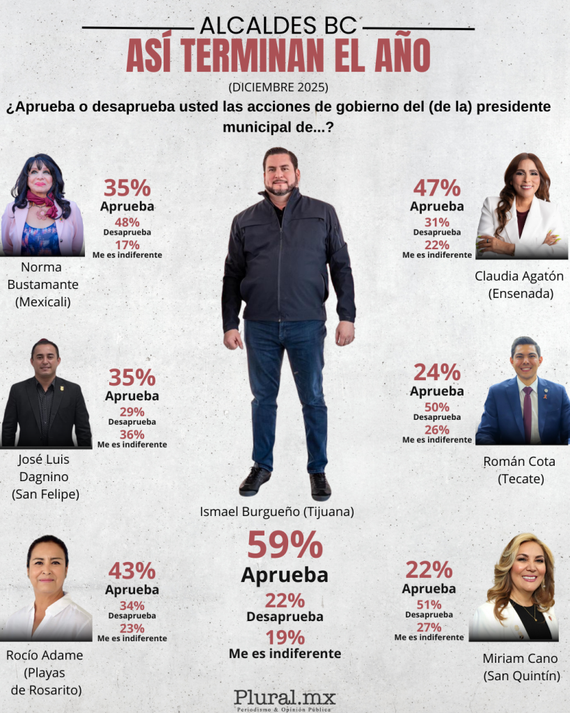 El cierre del año deja un escenario desigual entre los gobiernos municipales de Baja California: mientras Burgueño se mantiene en una posición sólida, la mayoría enfrenta retos de aprobación que marcarán el rumbo político de 2026.