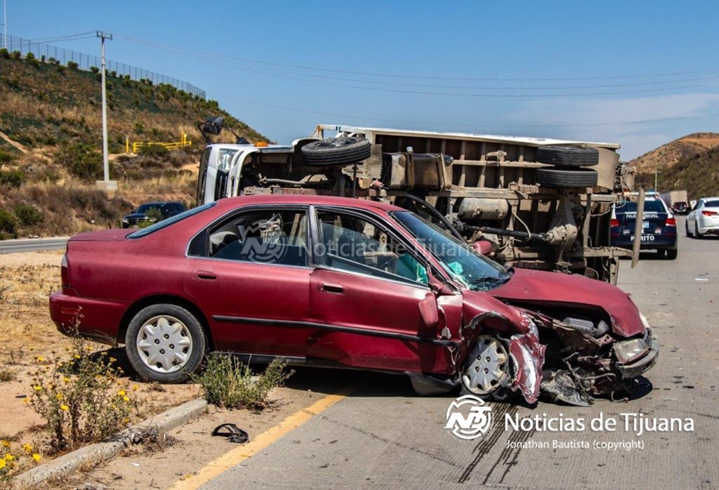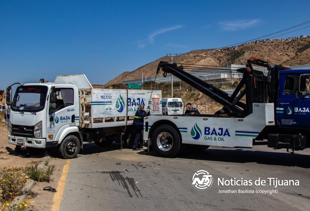 El percance involucró a un Honda Accord color guinda y un camión de la empresa Baja Gas. De acuerdo con los primeros reportes, la unidad de carga intentó incorporarse a la vialidad invadiendo el carril de circulación, provocando el choque frontal contra el automóvil, cuyo frente quedó completamente destrozado.