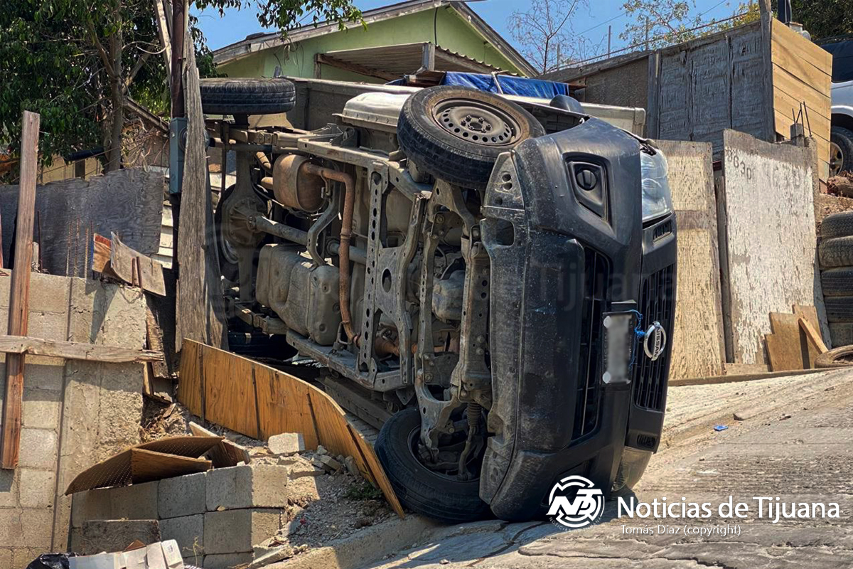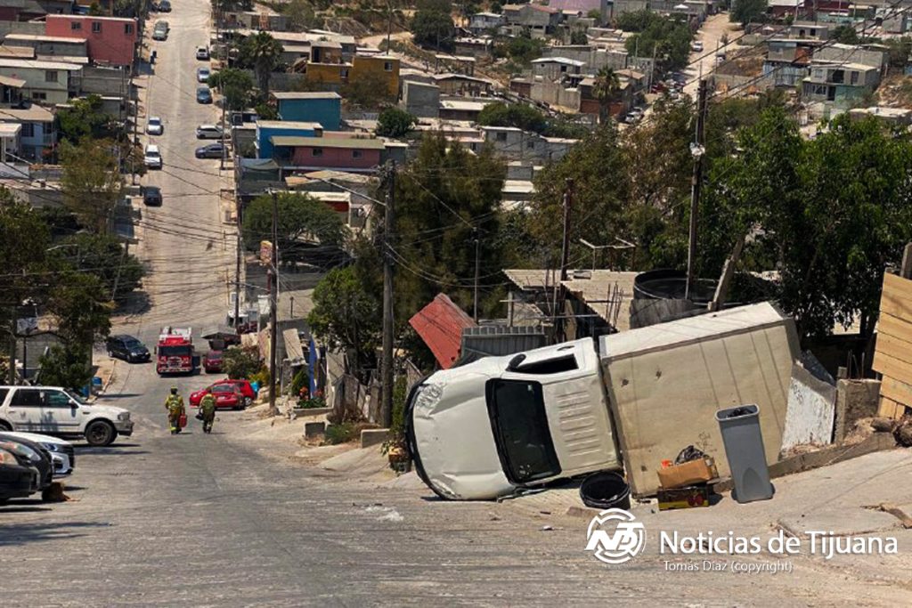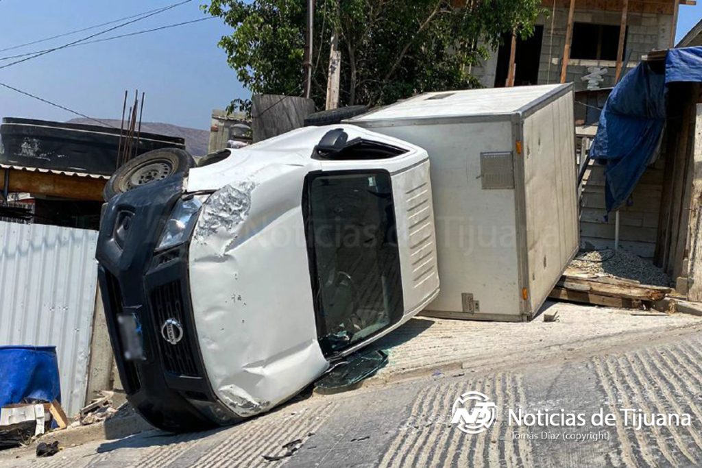 Una camioneta utilizada para entrega de paquetería sufrió una volcadura este lunes 4 de agosto en el cruce de las calles Primavera y Lira, en la colonia El Florido, cuarta sección.