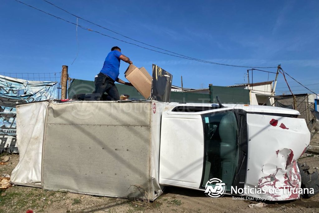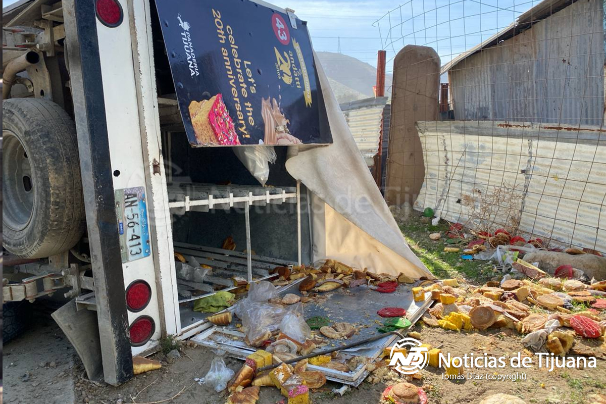 Una camioneta repartidora de la empresa “Panadería Tijuana” terminó en volcadura sobre el bulevar 2000, a la altura de Valle Bonito, en dirección hacia Natura, después de chocar contra un poste de concreto de cableado eléctrico. Aunque el accidente fue aparatoso, no hubo personas lesionadas.
