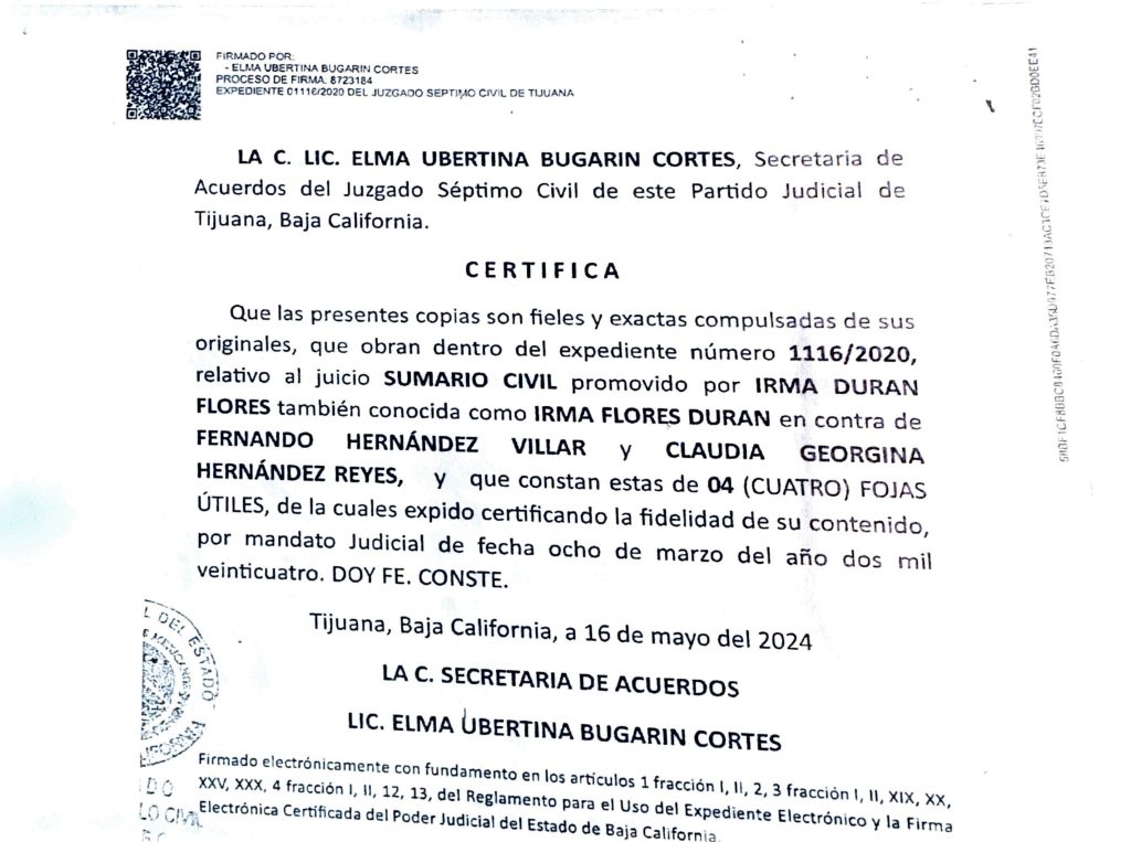 También señaló que los supuestos procesos judiciales relacionados con el divorcio y el juicio fueron tramitados en Playas de Rosarito y Mexicali, ciudades distintas a Tijuana, lo que, a su consideración, genera más dudas sobre la autenticidad de los documentos presentados.