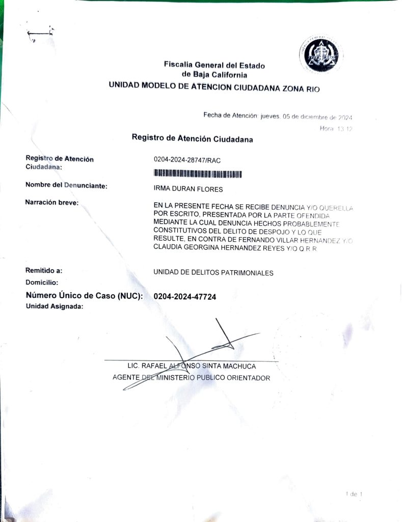 Además, informó que existen dos denuncias interpuestas ante la Fiscalía General del Estado: una presentada el 5 de diciembre de 2024 y otra el 6 de enero de 2026, en las que acusa a Fernando Hernández Villar y a Claudia Georgina Hernández Reyes por presuntos delitos de fraude procesal, falsificación de documentos, uso de documentos falsos y despojo.
