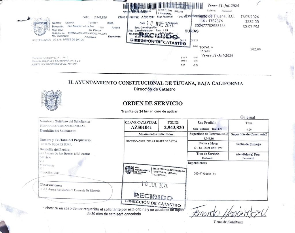 Durán Flores relató que fue hasta febrero de 2024 cuando Hernández Villar presentó documentación ante Catastro Municipal argumentando que había estado casado con ella y que, tras un supuesto convenio de divorcio, el terreno pasó a su propiedad. A partir de ese trámite, aseguró, la clave catastral original AZ501041 fue modificada a AZ501071, además de dividirse el predio en el registro municipal.