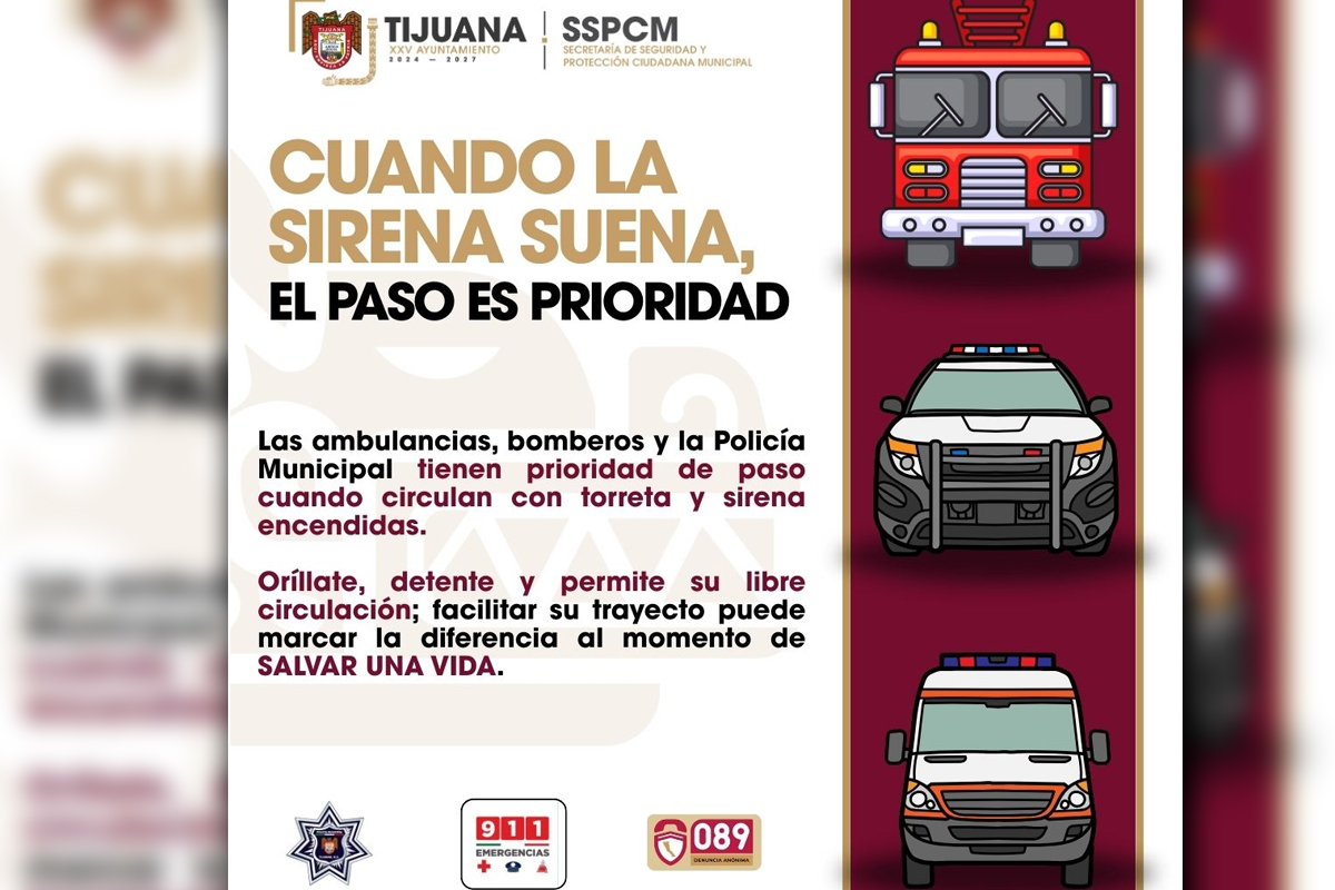 La Secretaría de Seguridad y Protección Ciudadana Municipal (SSPCM) pidió a la ciudadanía permitir el libre tránsito de patrullas, ambulancias y camiones de bomberos al escuchar el sonido de sus sirenas, a fin de evitar retrasos en la atención de situaciones de urgencia.