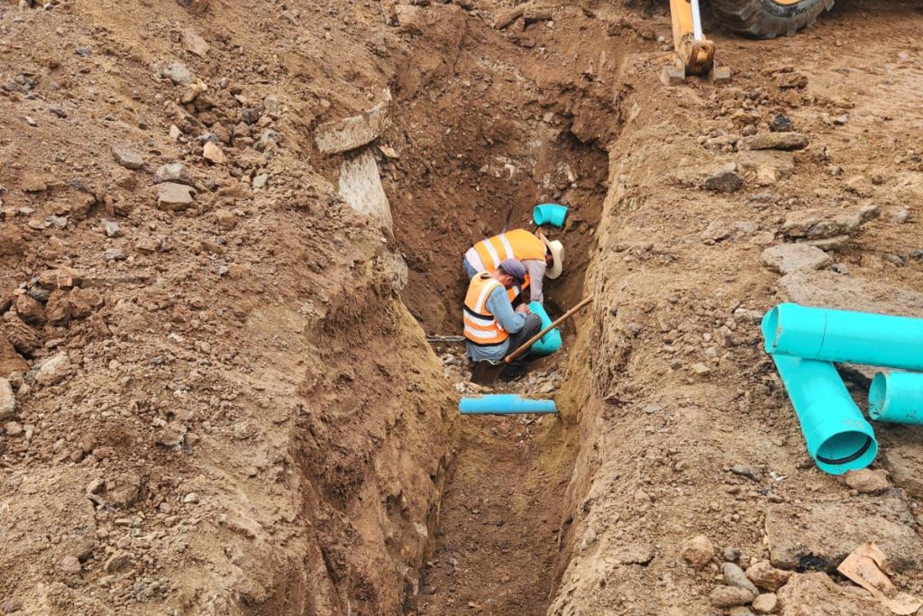 Asimismo, en la colonia Mesa del Aguajito se efectúan trabajos de instalación de red de alcantarillado sanitario con una inversión de 2.04 mdp, que incluyen 611 metros lineales de tubería, 12 pozos de visita y 50 descargas domiciliarias.