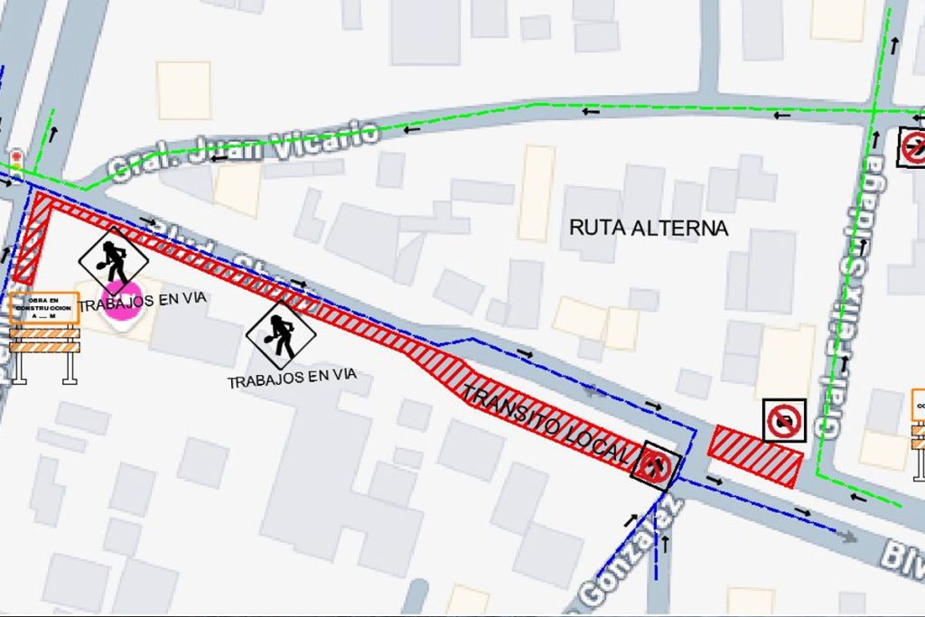 Como rutas alternas para quienes se incorporen desde el oriente al bulevar Hisense, se habilitarán temporalmente la calle General Félix Suldaga y la calle General Juan Vicario, ambas operando en un solo sentido.