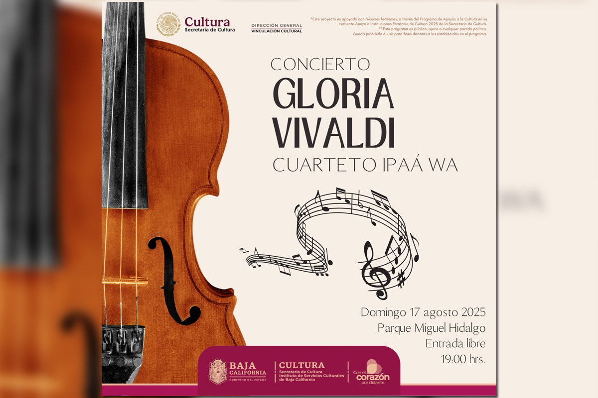 Con el propósito de acercar la música de concierto a la comunidad, el próximo domingo 17 de agosto a las 19:00 horas, el emblemático Parque Miguel Hidalgo de Tecate será el escenario de una destacada presentación del Cuarteto Ipaa wá, con su concierto titulado Gloria Vivaldi.