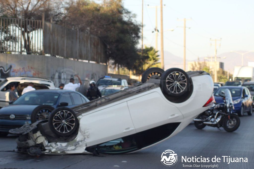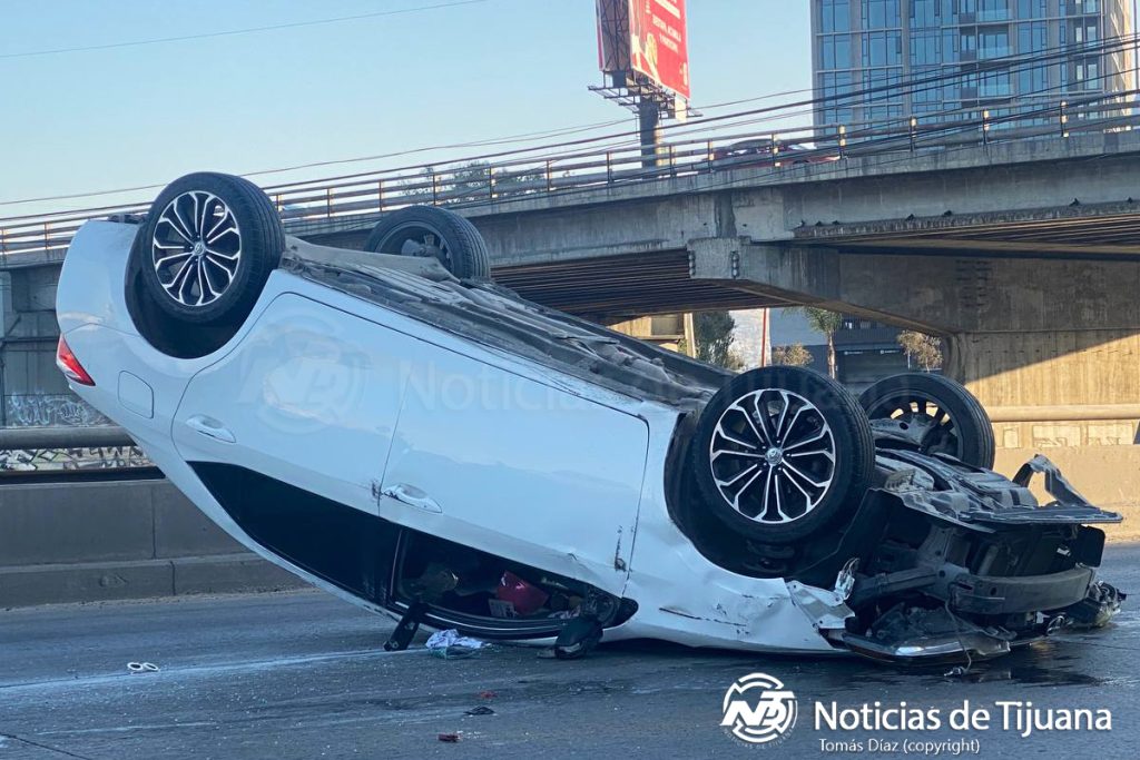 El percance ocurrió cuando el conductor, al volante de un Toyota Corolla color blanco con placas nacionales C05-NVJ-3, choco con dos vehículos estacionados, perdió el control y termino volcando.