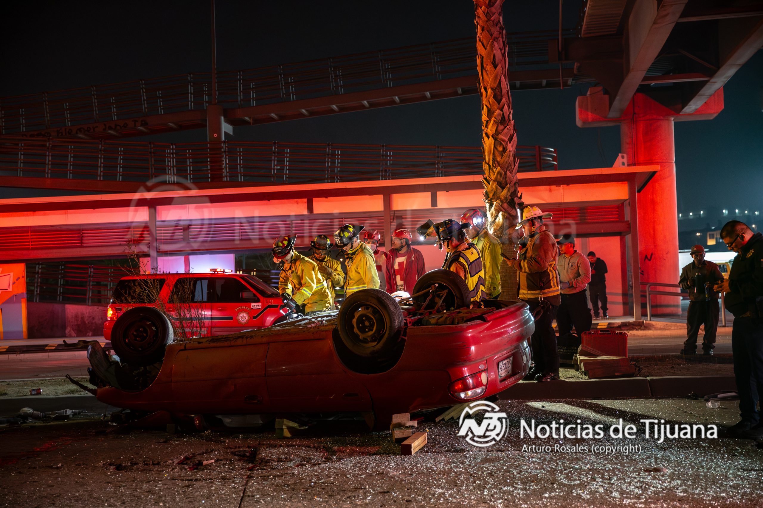 El conductor de un vehículo sedán color rojo, con placas de California 6RSV836, perdió el control e impactó contra el muro que sostiene un puente peatonal, lo que provocó que el auto terminara volcado.