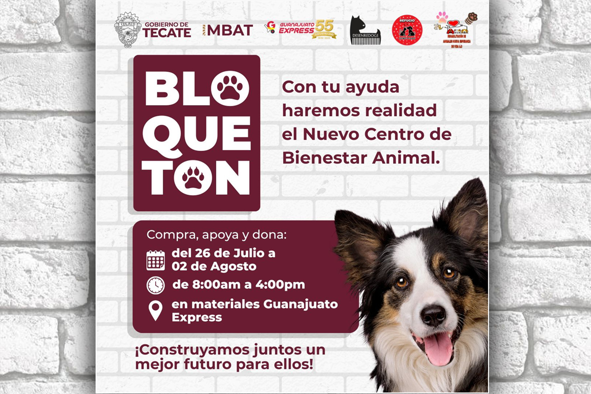 El Gobierno de Tecate, a través del Instituto Municipal de Bienestar Animal (IMBAT), convoca a la ciudadanía a sumarse al “Bloquetón”, una noble campaña de recaudación para la construcción del nuevo Centro de Bienestar Animal en el municipio.