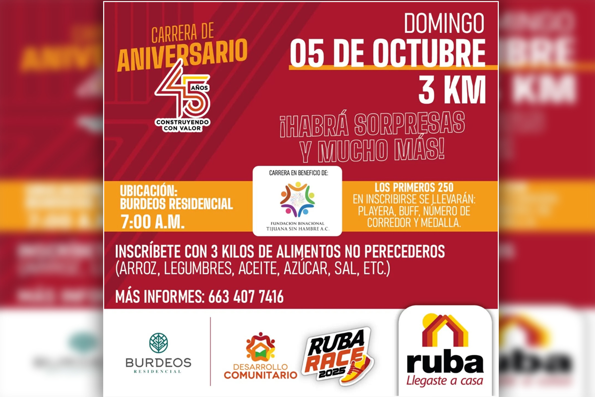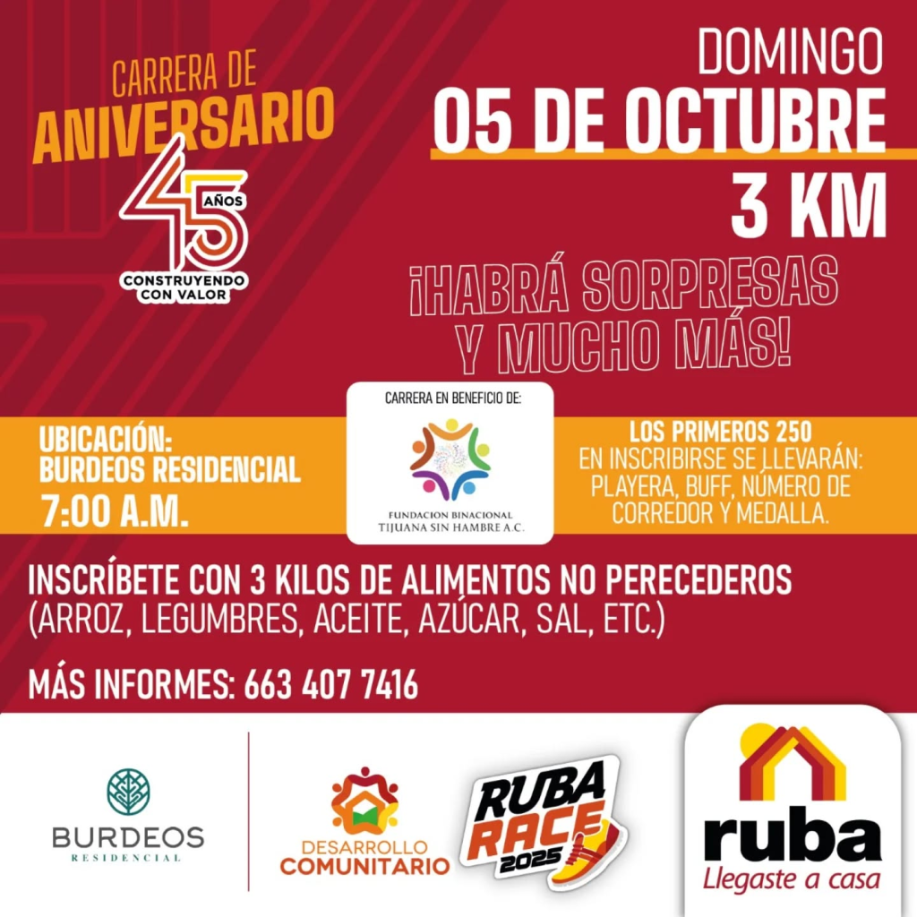Con motivo de su 45 aniversario, Ruba Tijuana anunció la realización de la carrera con causa Ruba Race, que tendrá lugar el próximo domingo 5 de octubre a las 7:00 a.m. en el fraccionamiento Burdeos Residencial.