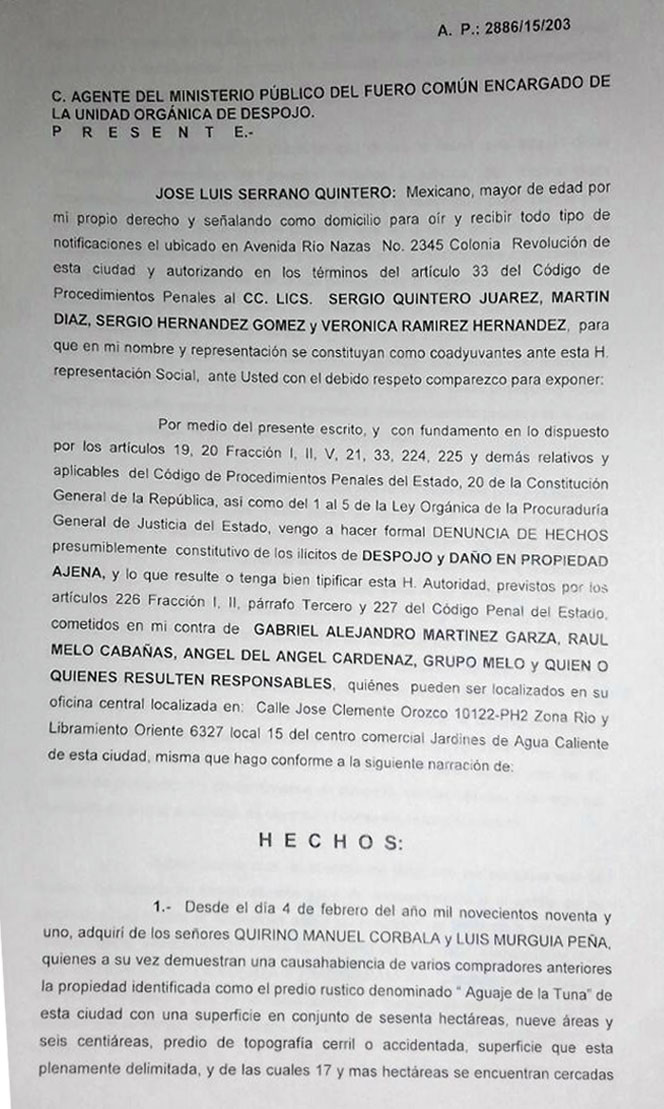 Tijuana, 13 Feb. 2018 (NDT).-  De acuerdo con la averiguación previa AP/2886/15/203 que obra en los archivos de la Agencia Especializada Contra Delitos Patrimoniales de la ciudad de Tijuana. En diciembre del 2015 José Luis Serrano Quintero, denunció ante la Agencia del Ministerio Público la invasión y daños de ruptura de cerco perimetral, perforación y cortes al terreno con maquinaria pesada que presuntos trabajadores del Grupo Melo realizaron en su propiedad denominada como ‘Aguaje de la Tuna’ mejor conocido como Valle del Pedregal, ‘el fraccionamiento que derrumbó las casas de Lomas del Rubí­’.