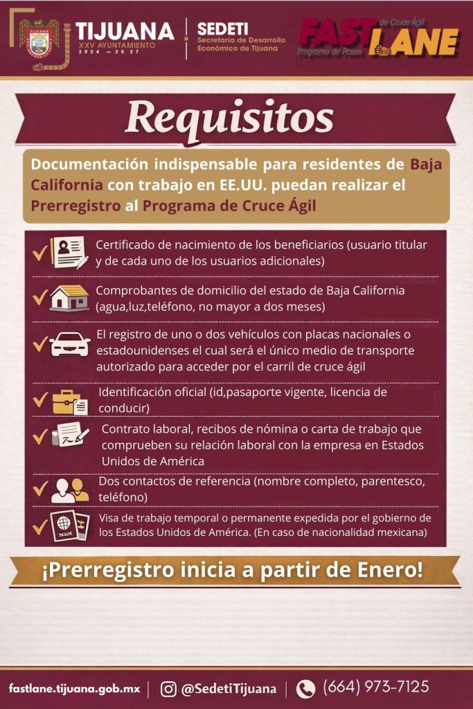 Con el objetivo de mejorar la movilidad y la calidad de vida de las y los tijuanenses que laboran en Estados Unidos, el Gobierno Municipal que encabeza el alcalde Ismael Burgueño Ruiz, a través de la Secretaría de Desarrollo Económico de Tijuana (SEDETI), anunció la apertura del pre-registro del Programa de Cruce Ágil para Trabajadores Transfronterizos.