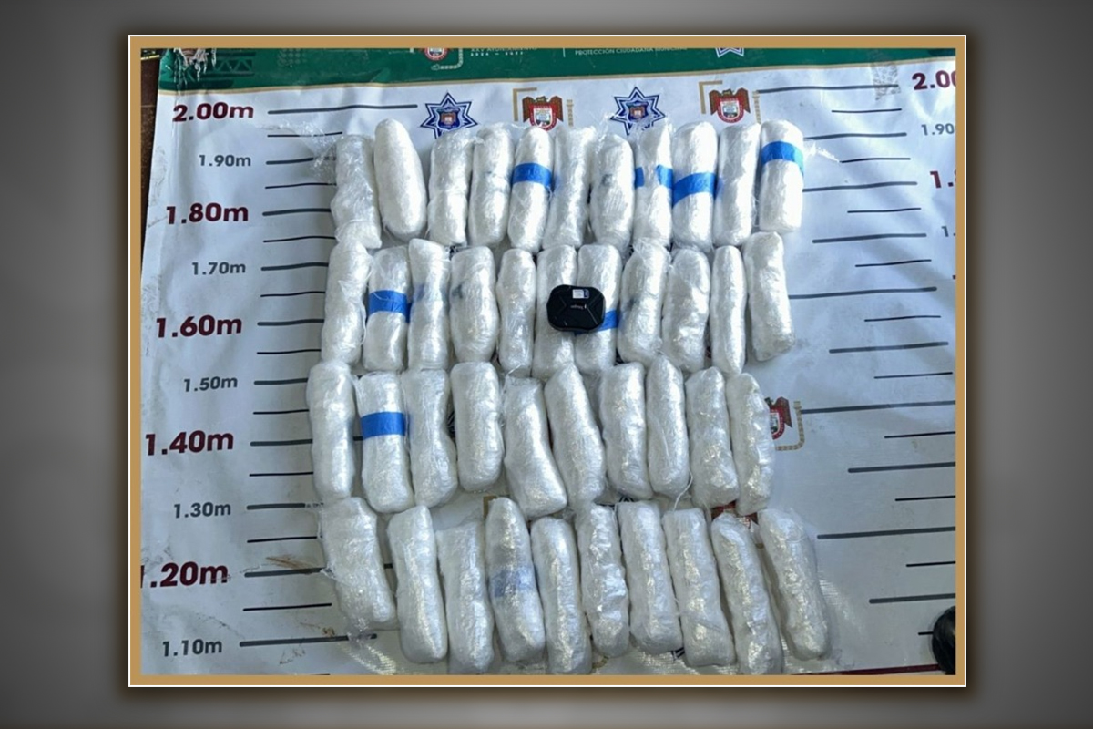 Agentes de la Policía Municipal acudieron al sitio y aseguraron un total de 42 paquetes que contenían “cristal”, con un peso aproximado de 19.5 kilogramos, además de un dispositivo geolocalizador color negro.