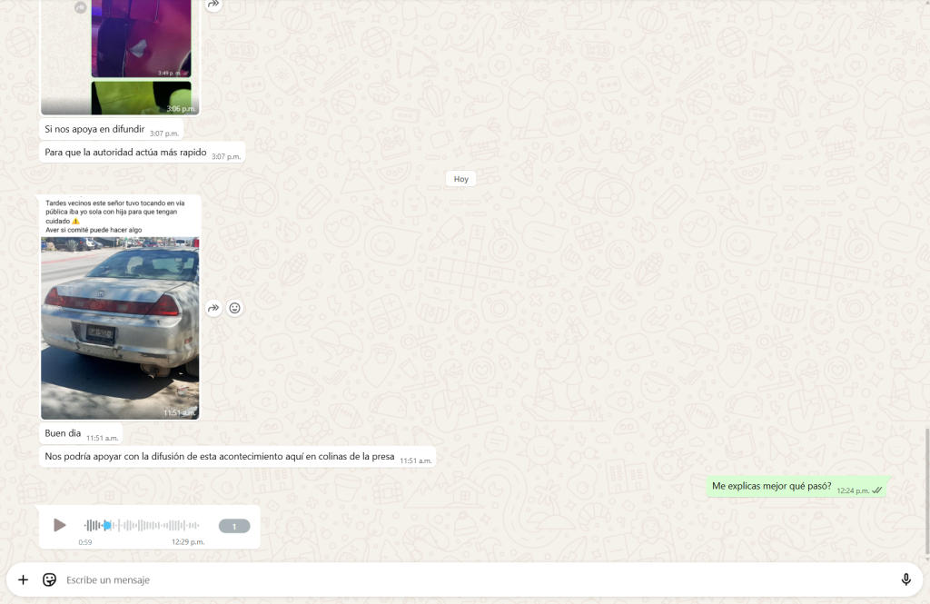 La situación salió a la luz en grupos de red social, tras el testimonio de una vecina que, mientras caminaba con su hija por la banqueta, fue testigo de un hombre realizando actos sexuales en la vía pública desde el interior de un vehículo estacionado.